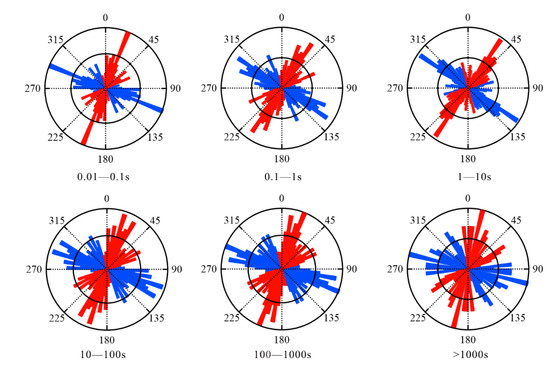 Rose diagrams of structural strike analysis in different periods (the red shows the calculated direction of the electrical strike; the blue shows the ambiguity of 90°).
