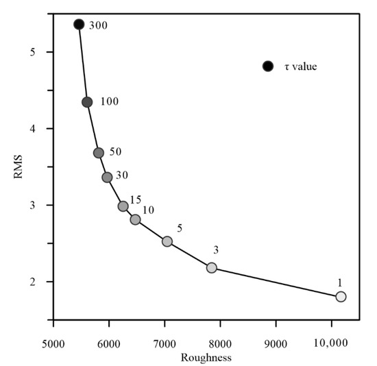 Model roughness and RMS curve (L-curve) obtained by inversion of different regularization factors (the different gray shades of each point represent different τ values, and the color becomes darker as the τ value becomes larger).