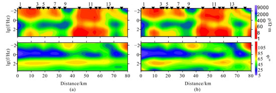 - Cai, J.; Chen, X. Refined techniques for data processing and two-dimensional inversion in magnetotelluric Ⅱ: Which data polarization mode should be used in 2D inversion. Chin. J. Geophys. 2010, 53, 2703–2714. (In Chinese) [Google Scholar] [CrossRef]