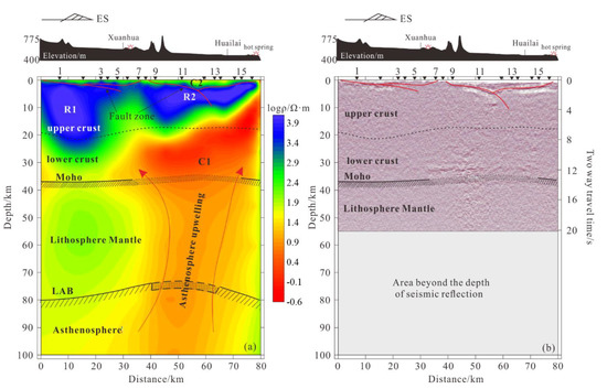 Deep geoelectric structure (a) and seismic reflection imaging (b) in the Huailai area (seismic reflection imaging modified according to [29]).
