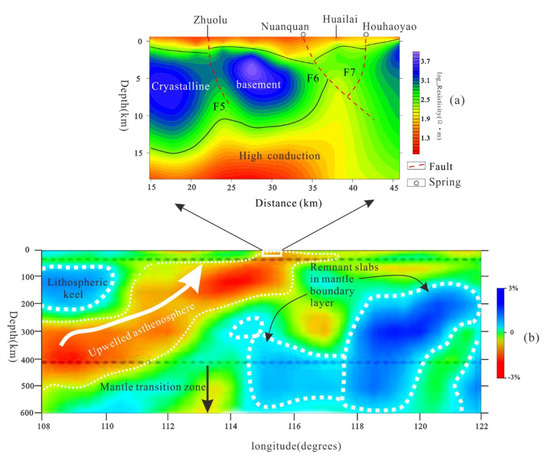 Secondly, the crystalline basement connects the deep heat source and the groundwater circulation system through the faults (F5, F6, and F7 in Figure 9a) in the basement. Then, the heat is transferred to the surface through the groundwater cycle. The crystalline basement plays an important role in heat storage; it ensures that heat will not be lost quickly and can then be continuously transferred to the surface.