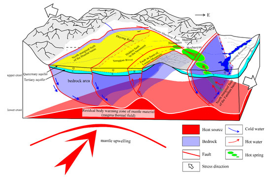 Third, under the influence of NW extensional tectonic stress, the regional faults (F1, F2, F3, and F4 in Figure 1) create the permeability of the upper crust, which ensures the recharge and circulation of groundwater that allows for the continuous transference of heat energy to the surface.