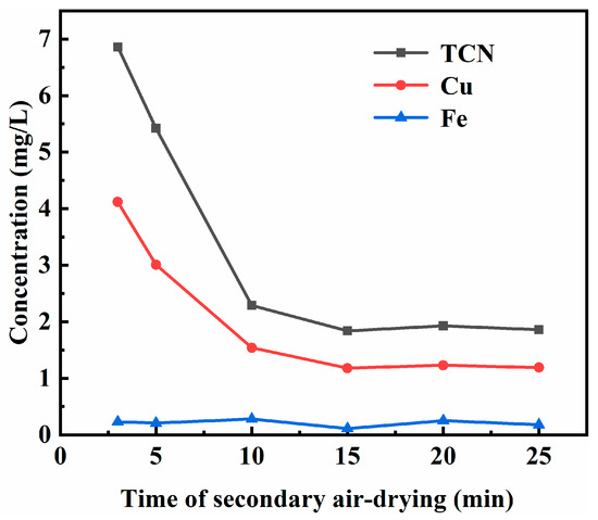 Figure 3 illustrates the leaching toxicity results of the backwashed cyanide tailings under different backwash conditions. The experiments were carried out under the following conditions: pH 9 of the backwash water, 1.17 mg/L of the total cyanide concentration of the backwash water, 1.5 min of the primary air-drying time, and 10 min of the secondary air-drying time. As observed in Figure 3, the leaching toxicity of backwashed cyanide tailings decreased with the increase in backwashing multiples. When the backwash water multiple increased from 0.5 to 1, the concentration of TCN in the leached toxic solution from backwashed cyanide tailings decreased from 6.8 mg/L to 0.374 mg/L, and the concentration of Cu also decreased from 6.09 to 0.15 mg/L. When the backwash water multiples were 0.5 and 0.6, the total cyanide concentration in the toxic liquid leached from the backwashed cyanide tailings was 6.8 mg/L and 5.26 mg/L, respectively, both of which are higher than 5 mg/L. In order to ensure that the leaching toxicity of the backwashed cyanide tailings meets the technical requirements for the disposal of cyanide tailings in the TSPC and to reduce the water consumption, the optimal multiple of backwash water should be 0.7.