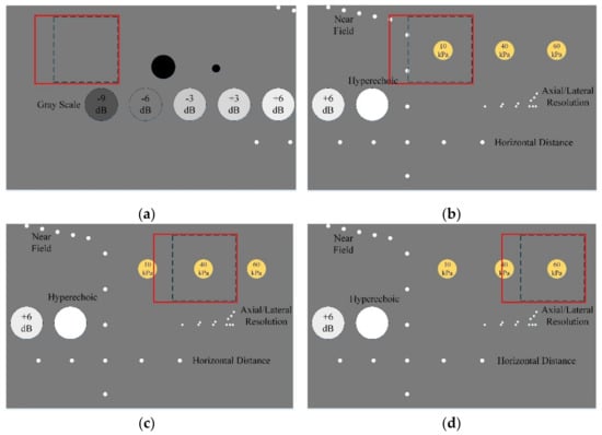 In Figure 1a, a larger solid black circle and a smaller solid black circle on the right side of the region of interest represent the anechoic stepped cylinders. The circles with different decibels on the lower side of the region of interest represent grayscale target groups, ranging from −9 dB to +6 dB. In the region of interest of Figure 1b–d, there are inclusions with a diameter of 6 mm, which are different from the background elasticity, and their elasticity is 10 kPa, 40 kPa and 60 kPa, respectively. In these figures, the small white dots far smaller than the size of the inclusions are the target points, and the white circle without markings is a hyperechoic region of the same size as the other grayscale target groups.