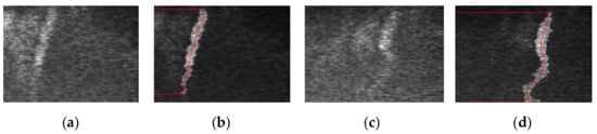 In this paper, the real-time curve tracing is performed for the 10th frame image of shear wave propagation in the targeted imaging area of Figure 1a. Figure 2a shows the original propagation trajectory of the shear wave. The shear wave front is obtained by the directional filter matrix, and then the central point of each transverse shear wave front is connected, as shown with the red curve of Figure 2b. Since the shear wave propagates in a homogeneous region, the tracing curve is close to a straight line with an inclination angle. Then, we do the same operation for the 30th frame image of shear wave propagation in the targeted imaging area of Figure 1d. Similarly, Figure 2c shows the original propagation trajectory of the shear wave, and the tracing curve is shown with the red curve of Figure 2d. Owing to the deformation of the shear wave front at the inclusion, the tracing curve protrudes to the right, which is consistent with the expected result. Because the shear wave front cannot cover the whole longitudinal range, we set two transverse lines at the head and tail of the shear wave front.