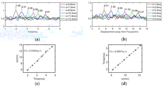 To verify and compare the performance of the proposed method, the time-to-peak and the lateral peak method are used to estimate the shear wave velocity in the homogeneous region under the same conditions, taking a homogeneous region with a Young’s modulus of 30 kPa as an example. The implementation processes of the time-to-peak method and the lateral peak method are shown in Figure 4. The time-to-peak method finds out the maximum time of shear wave displacement in each transverse position. The curves in Figure 4a describe the relationship between the energy of the shear wave and the time at different displacements (these data were normalized). Therefore, the shear wave velocity can be estimated from the known displacement and the time to peak, as shown in Figure 4c. The lateral peak method is used to select the information of the shear wave energy peak point to process. As shown in Figure 4b, the curves describe the relationship between the shear wave energy and distance away from the focus point at different times (these data were normalized). In that way, the velocity of the shear wave in a certain period of time can be estimated by the known time interval and the peak displacement, as shown in Figure 4d.