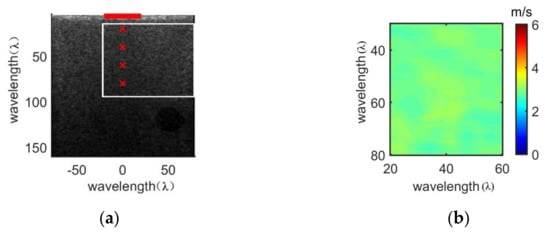 According to the real-time curve tracing method proposed in this paper, the experimental data of a high-frame rate shear wave propagation video can be obtained in the homogeneous region of the 040GSE ultrasound phantom shown in Figure 1a, with which the shear wave velocity image reconstruction is realized. The B-ultrasound image of the homogeneous area is shown in Figure 5a. In the B-ultrasound image, the thick red line at the top corresponds to the position of the probe, the white rectangle is the selected region of interest and the four red cross marks in the longitudinal direction correspond to the focus coordinates in Table 1. The real-time curve tracing method is utilized to reconstruct the shear wave velocity image of the selected region of interest in the homogeneous region of the 040GSE ultrasound phantom. In order to facilitate the presentation of the reconstruction effect, the results in Figure 5b are selected for subsequent detailed analysis, with a transverse range of 20 λ to 60 λ and a longitudinal range of 30 λ to 80 λ.