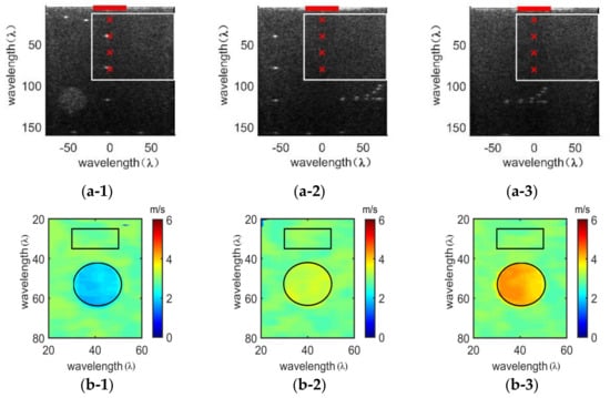 In this subsection, the shear wave velocity images of the region of interest containing a stiff spherical inclusion in Figure 1b–d are reconstructed, of which the B-ultrasound images are shown in Figure 6(a-1,a-2,a-3), respectively. The elasticity of the inclusions is 10 kPa, 40 kPa and 60 kPa, and the background elasticity is 30 kPa. When reconstructing the shear wave velocity image of the stiff spherical inclusion regions, the image processing is the same as that of the homogeneous area. Two targeted regions are intercepted for subsequent analysis, as shown in Figure 6(b-1,b-2,b-3). The background is selected as the black rectangle area with a transverse range of 30 λ to 50 λ and a longitudinal range of 25 λ to 35 λ. The inclusion is selected as the black circular area with a diameter of 24 λ, about 6 mm.