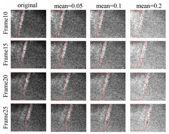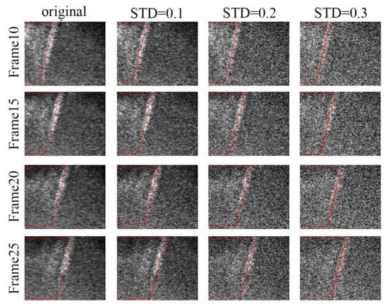 In theory, even under different noises, the motion state of a shear wave can be accurately characterized as long as the propagation trajectory of the shear wave can be identified. In order to further analyze the noise adaptability of the real-time curve tracing method, the shear wave propagation images are processed under different noises. Four frame tracing curves with an initial frame number of 10 and frame interval of 5 are selected as raw reference data to conduct two sets of experiments. In the first experiment, these raw reference data are contaminated with zero-mean Gaussian noise, of which the standard deviation (STD) is set to 0.1, 0.2 and 0.3. In the second set of experiments, the mean value of Gaussian noise added in the raw reference data is set to 0.05, 0.1 and 0.2, and the standard deviation is 0.1. The results of the above two sets of experiments are given in in Figure 7 and Figure 8, respectively.