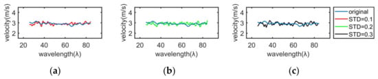 From Figure 7 and Figure 8, we can see that even in the case of noise, the real-time curve tracing method can still express the shear wave trajectory accurately. Since the longitudinal range of the shear wave tracing curve has changed after adding noise, this paper only selects and analyzes the common longitudinal range of four tracing curves, namely, 25 λ to 85 λ. Hereon, the real-time curve tracing method is used to estimate the shear wave velocity under the condition of no artificial noise or different noises, and the standard deviation and relative error are compared. The results are shown in Figure 10, Figure 11 and Table 4, and the theoretical shear wave velocity is 3.1623 m/s.