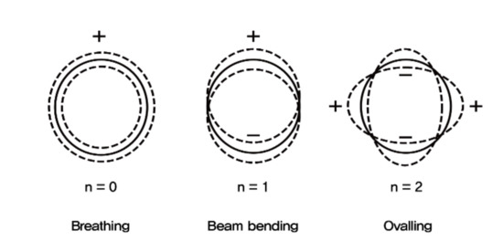 The coupled vibration of the fluid and the pipe can appear in several modes, as shown in Figure 1. The basic forms of coupled vibration are the n = 0 ‘breathing mode’ and n = 1 ‘bending mode’ of the pipe. If the pipe is a single beam, it corresponds to the bending vibration of the single beam. In general, because water supply pipes are buried and constrained, it is difficult to detect a large-amplitude bending vibration. The n = 2 mode is the ‘ovalling mode’, which is mainly seen at high frequencies.