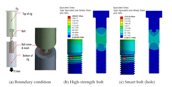 Finite element analysis (FEA) is an analytical method generally used to evaluate a specific object under conditions that simulate the applied environment and is used in various fields [21,22]. In order to confirm the applicability of the smart bolt, FEA was conducted with ANSYS 2019 R2 to verify the integrity of the bolt depending on the presence or absence of a bolt hole for inserting a strain gauge. The physical properties of the bolt (SM45C carbon steel) are E = 250 Gpa, ν = 0.29, σy = 490 Mpa, and σu = 686 MPa. The bonding condition between the jig and the bolt is bounded, and the boundary condition of the top of the jig is fixed. After the finite element modeling, as shown in Figure 3, the von Mises equivalent stress was examined by moving the lower jig coupled with the bolt 0.1 mm downward.