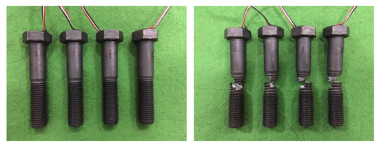 The robustness of the smart bolt was confirmed by determining the maximum load through a tensile test of the smart bolt that showed relatively high equivalent stress. Tensile tests were performed on four specimens with a strain gauge inserted. The tensile tests were conducted on two specimens each, at tensile speeds of 1 mm/min and 2 mm/min, as shown in Figure 4.
