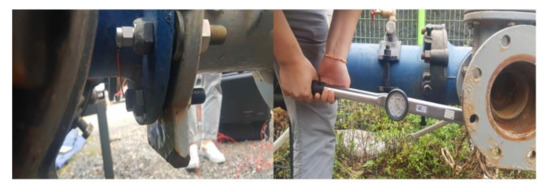 Although the bolt cross-section was reduced by drilling the inside of the bolt and inserting the strain gauge, it still met the bolt tightening torque required by the standard specification for connections by water supply pipes in Korea (KCS 57 30 20: 2017).