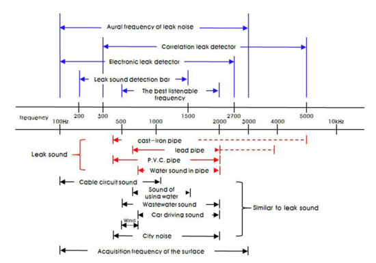 Generally, when the ring frequency is related to the coupled vibration in 65 A, PVC (Poly Vinyl Chloride) has 7559 Hz, steel pipe has 23,111 Hz, and the cast-iron pipe has 23,801 Hz [12,14]. Figure 8 shows the audible range of the leak detection equipment and the frequency range of the leak sound.