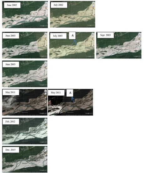 The considered river reach was also the object of previous literature studies [32,34,43]. Bertoldi et al. [32] investigated, in a 1-km-long reach, the morphological changes induced by different flow and flood pulses. Surian et al. [34] considered a 14 km long reach and explored, over long timescale, the existence of a threshold discharge above which erosion of vegetated patches occur. Gurnell et al. [43] analyzed, over short timescale (i.e., from single floods to decades), the river’s islands and vegetated patches development processes in a reach few kilometers long, based on the conceptual model proposed by Gurnell et al. [19]. In the present work, the attention is focused on the stream pattern changes and the evolving morphological features in a decadal time scale. Satellite images available from Google Earth in a time period 13 years long (from June 2002 to December 2015), as shown in Figure 2, have been considered for the analysis. Field photos (by courtesy by A. Sukodolov and T. Sukhodolova- IGB Berlin, Germany) have been also used to check the river’s pattern and vegetation characteristics especially during periods of times when no satellite images were available.