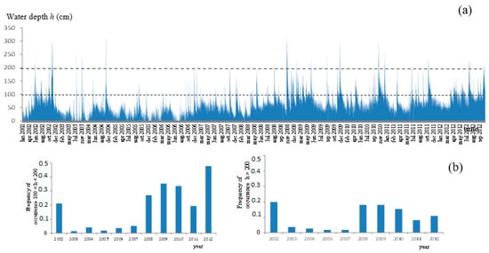 Based on the aforementioned, the water depths registered the Villuzza gauging station in the time period between January 2002 and September 2012 have been considered for the analysis. From Figure 3a it is clear that frequent peaks ranging from 100 cm to 200 cm and sporadic peaks over 200 cm occur. This trend has suggested to assume for the analysis a low threshold value of the water depths equal to 100 cm. This is in line with previous Bertoldi et al.’ [32] findings highlighting that the water level starts to attack bar surfaces at a stage of around 130 cm and a complete gravel islands inundation occurs at around 200 cm. Figure 3b reports the estimated values of the frequency of occurrence of water depths in the range 100 cm < h < 200 cm and of the frequency of occurrence of water depths higher than 200 cm during the examined time period. For both cases it is clear that during the year 2002 the frequency of occurrence is around of 20%, in the time period 2003–2007, the frequency of occurrence is very low; it suddenly increases in the year 2008 maintaining high values in the time period 2009–2012.