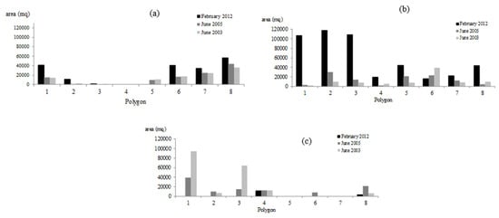 As Table 1 shows, in June 2003 the percent area occupied by the vegetation class A tends to decrease slightly as one passes from polygon 1 to polygon 4 and then it increases until reaching polygon 8 where it assumes a value of 2%; the percent area occupied by the vegetation class B is almost equal (around 4%) in all the polygons with the exception in polygons 1 and 6; in June 2005, the percent area occupied by the vegetation class A is almost the same as that observed in June 2003 and the percent area occupied by vegetation class B generally increases, with exception of polygons 4, 6 and 8 where it slightly decreases; in February 2012, the percent area occupied by the vegetation class A slightly increases with exception of the polygons 5 and 6 where it decreases; the percent area occupied by vegetation class B strongly increases, assuming values ranging from 8% (in the polygon 6) to 46 % (in the polygon 1).