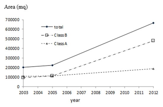 Figure 6 reports the total area occupied by vegetation of classes A and B along the considered river reach in June 2003, in June 2005 and in February 2012. It can be seen that passing from year 2003 to year 2005 the total area occupied by both classes of vegetation does not change a lot; passing from year 2005 to year 2012 the total area occupied by vegetation strongly increases, especially for the vegetation class B. It should be considered that the increasing trend occurring in Figure 6 between years 2005 and 2012 has been also verified by examining the available field photos.