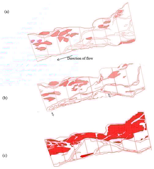 Figure 7 shows the vegetation cover (for classes A and B) and the active channels identified from the images taken in June 2003, in June 2005 and in February 2012. From this figure, it can be clearly seen the difference both in the vegetation cover and in the stream pattern passing from June 2003 to February 2012. In particular, it can be observed that the extension of the vegetation cover always increases on the right side of the study reach and the sediment deposition especially on the left side. The vegetation cover determines a sort of interface between the vegetated-dominated area, where the flow resistance is more significant, and the floods-disturbances-dominated area, where the action due to flow is more significant. According to previous literature findings [50,51,52], this behavior can induce the progressive abandonment of secondary channels so that the stream has the tendency to evolve towards a single thread channel.