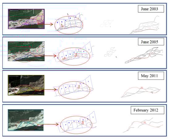Morphological features and evolution from June 2003 to February 2012 (images obtained from Google Earth, Image ©2015 DigitalGlobe).