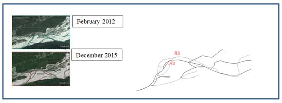 By inspecting the images of class II, a stream pattern very different from that observed between June 2003 and June 2005 can be seen. In particular, in May 2011 a meander bend of high curvature is clearly visible. This suggests that passing from June 2005 to May 2011 a significant lateral migration of the bend occurred. Then, passing from May 2011 to February 2012 such a high-curvature bend furtherly expands laterally with no evident downstream migration. As an example, the reference point R2 is found along the transient T4 both in May 2011 and in February 2012. Thus, in such a time period, the meandering bend becomes the dominant morphological feature. According to the literature [53,54,55] for a high-amplitude meander wave the lateral expansion prevails over the downstream migration.