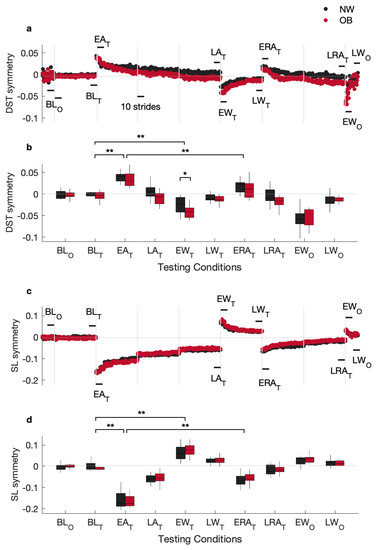 Experimental paradigm showing the periods of testing conditions in a light gray vertical line: over-ground baseline (), treadmill baseline (), early treadmill adaptation (), late treadmill adaptation (), early treadmill washout (), late treadmill washout (), early treadmill re-adaptation (), late treadmill re-adaptation (), early over-ground washout (), late over-ground washout (). Double-limb support time (DST) symmetry (a) and step length (SL) symmetry (c) values for sequential strides over the ground and on the treadmill between adults with normal weight (dark grey) and obesity (dark brown) across all testing conditions. A value of 0, represented as a light gray horizontal axis, indicates perfect symmetry. Means and standard errors for DST symmetry (b) and SL symmetry (d) are shown between the body mass index (BMI) groups (NW: normal weight; OB: obesity) across testing conditions. ** p < 0.01; * p < 0.05.