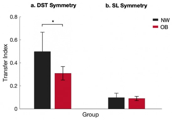 Transfer Index for adults with normal weight (dark grey) and obesity (dark brown) for double-limb support time (DST) symmetry (a) and step length (SL) symmetry (b). The transfer index indicates the amount of adaptation transfer from the treadmill to over-ground walking in each BMI group. For both adapted parameters, the transfer index is greater in adults with normal weight than in adults with obesity. Error bars indicate the standard deviation. Asterisk indicates a significant difference between groups. * p < 0.05.