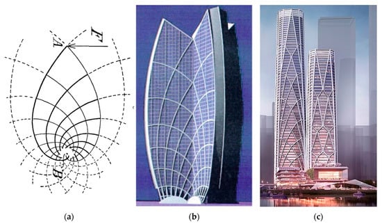 (a) Original Michell’s minimum frame [9], (b) structural design by Zalewski and Zabłocki [105], and (c) CITIC financial centre in Shenzhen by SOM [105].