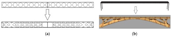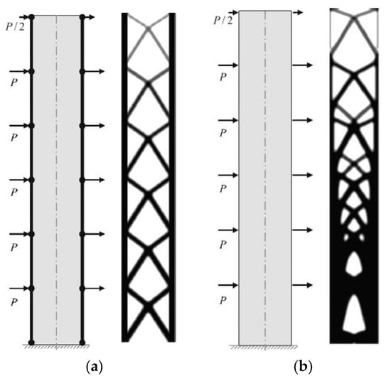 (a) From cellular to topology optimised beam [106] (reproduced under the Creative Commons Attribution 4.0 International License, http://creativecommons.org/licenses/by/4.0/ accessed on 25 February 2021) and (b) bridge topology optimisation from problem statement to optimal solution [104].
