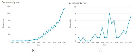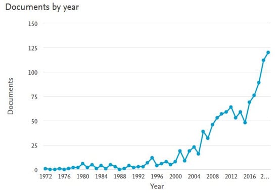 Performing a data analysis with the Scopus search tool (www.scopus.com) on 28 November 2020, it has been possible to observe that Topology Optimisation has been referred in scientific literature since the early 1980s, but not until the new millennium has the related scientific output been consistently increasing (Figure 3a). This fact can be related to the well-known recent computing power increase and massification, on which TO has a strong dependence. Furthermore, the ascendant trend has increased over the last 5 years, up to almost 1200 documents per year in 2020, during which more scientific and engineering disciplines have reportedly started employing TO more systematically. An interesting etymological approach lies in noticing an early word choice for Topological Optimisation over Topology Optimisation which, however, was not able to be employed in more than 10% of the analysed documents, over the recent years (Figure 4).