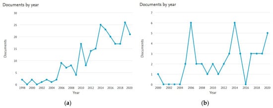 Scopus search data analysis for (a) Topology Optimisation and (b) Topology Optimisation AND Civil Engineering, in Title, Keywords or Abstract in Research, Review, and Conference articles, on 28 November 2020.