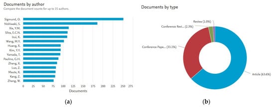 Scopus search data analysis for Topology Optimisation in Title, Keywords or Abstract in Research, Review, and Conference articles without date or discipline constraints, on 28 November 2020, organised by (a) author and (b) document type.