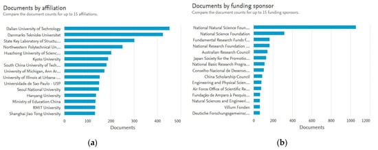 Figure 6a as well as Figure 7a,b offer a brief insight on the field leading players. As a result, we observe Sigmund, Nishiwaki, and Xie leading the list of most prolific authors. At the same time, the Dalian University of Technology, Danmarks Tekniske Universitet (DTU) and State Key Laboratory of Structural Analysis for Industrial Equipment are the most productive research centres. The National Natural Science Foundation of China is the primary funding agent for the research on this topic. It is well ahead of the US National Science Foundation and not matched by the remaining entities.
