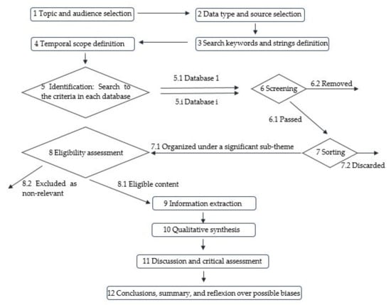 The screening criteria for removal included duplicate items, the mismatch between title and content, corrupted files, and the impossibility of accessing the document. Discarded items under the Sorting stage criteria comprised documents whose content do not adhere to any of the sub-themes previously defined as meaningful for this article scope, and better described in Section 3 to Section 8. The eligibility assessment was focused on the document content, excluding items without a particular relevance, without critical information, with any perceived methodological shortcoming or possible strong bias due to funding.