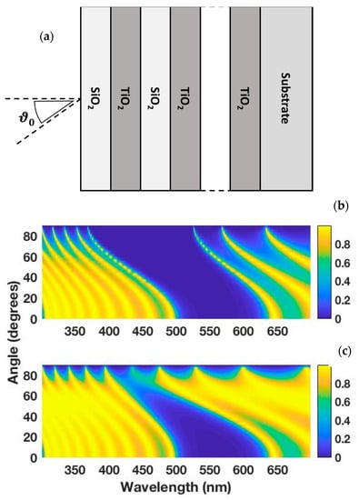For a transverse electric (TE) wave and , while for a transverse magnetic (TM) wave and . Finally, to calculate the light transmission of the multilayer photonic crystal we can use the following equation: