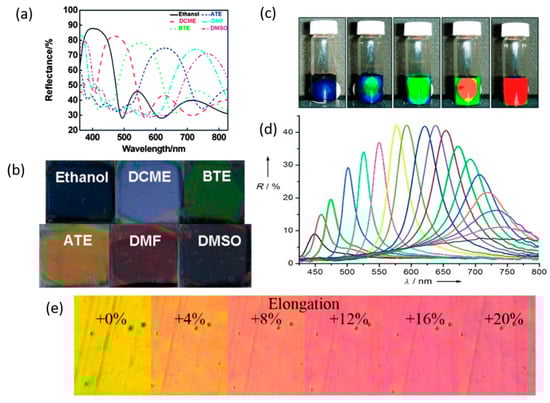Different cases of tunable photonic crystals. (a,b) Reflectance spectra and visual effect of PMMA-co-PHEMA-co-PEGDMA) and titania photonic crystals (PhCs) in different solvents. Adapted from reference [32] by permission of The Royal Society of Chemistry. (c,d) Effect of the magnet–sample distance on polyacrylate-capped superparamagnetic magnetite (Fe3O4) colloidal nanocrystal clusters (CNCs). Adapted from reference [110] by permission of John Wiley & Sons. (e) Changing of structural color of grating nanostructured polydimethylsiloxane membrane/TiO2 as the elongation increases. Adapted from reference [31].