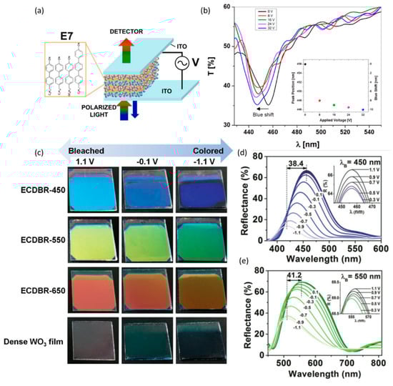 (a) Schematic representation of a 1D photonic crystal for photonic band gap tuning applying an electric voltage and (b) its transmission spectra after the application of an electric field. Adapted from reference [83] under permission from the American Chemical Society. (c) Optical effect of an electric field application to 4-bilayer photonic crystals and dense WO3 film. (d,e) Changing of reflectance spectra of PhC with peaks at 450 nm and 550 nm. Adapted from reference [26] under permission from John Wiley & Sons.