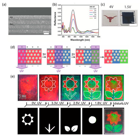 (a–c) Cross-sectional SEM image, reflectance spectra and optical image of 1D photonic crystals constituted of indium tin oxide (ITO) NCs and WO3-x NC layers (BS1). Adapted from reference [90] under permission from John Wiley & Sons. Effect of an electric tuning and UV curing combination on E-ink. (d) Schematic mechanism and (e) optical example of lithographical printing by photomask covering. Adapted from reference [91] under permission from John Wiley & Sons.