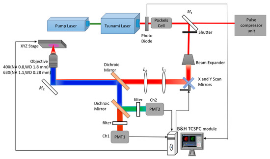 An experimental MPM setup was used for the entire FCS experiments. The schematic diagram of the experimental multiphoton setup is shown in Figure 2. Two-photon excitation was achieved by a mode locked femtosecond pulsed Ti: Sapphire laser (Tsunami laser, Spectra Physics, Santa Clara, CA, USA) pumped by Millenia laser (532 nm, Spectra Physics, Santa Clara, CA, USA532 nm) and the laser intensity was modulated by a Pockels cell (350-80LA, ConOptics, Danbury, CT, USA). The excitation wavelength was set to 800 nm with an average laser power of around 20 mW. The pulse width dispersion (~100 fs) at sample plane was ascertained by an autocorrelator (CARPE, APE GmbH, Berlin, Germany) and pulse compressor (Femto control kit, APE GmbH, Berlin, Germany). Two water immersed objective lenses (40×, NA 0.8 C Achroplan NIR—working distance 1.8 mm and 63×, NA 1.2 C Apochromat—working distance 0.28 mm Carl Zeiss, Oberkochen, Germany) were employed for all measurements. The fluorescent signals were collected by two GaAsP detectors (H7422P-40 MOD, Hamamatsu Photonics, Hamamatsu, Japan), interfaced to time correlated single photon counting modules (SPC 150, Becker & Hickl GmbH, Berlin, Germany). Two spectral detection channels were enabled by using a dichroic mirror (550 nm cut off, Semrock Inc, New York, NY, USA) combined with two filters 580/150 nm and 525/50 nm (Semrock Inc, New York, NY, USA) which enabled two channels 1 (red, 550–655 nm) and 2 (blue, 417–477 nm). A sample volume of ~0.5 mL was placed in a cell dish with glass bottom (µ-Dish 35 mm, Ibidi GmbH, Gräfelfing, Germany) which was mounted on MPM stage. FCS measurements were performed by parking the laser beam at a specific location within the sample. Each measurement had the duration of 30 s and measurements were repeated 5 times to get statistical average. Autocorrelation traces were saved from each step and raw data extracted from SPCM64 software (version 9.82, Becker&Hickl GmbH, Berlin, Germany) and burst analyser (burst analyser 2, Becker&Hickl GmbH, Berlin, Germany). All FCS diagrams were plotted and analysed in MATLAB (MathWorks Inc., Natick, MA, USA) using a customized code (see Supplementary Material).