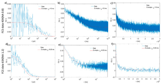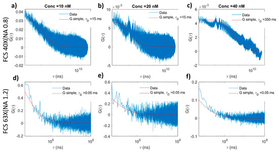 The effect of concentration on FCS data obtained from Rhodamine B solution at different concentrations (10 nM, 20 nM and 40 nM) generated by different objective lenses (a–c) 40× (NA 0.8) and (d–f) 63× (NA 1.2). Autocorrelation function data (blue) and fitted data (red) are shown. The data was obtained from red channel (580/150 nm) at 800 nm excitation wavelength, 25 mW excitation intensity.