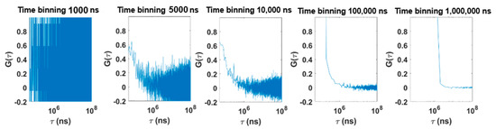 The effect of time binning in the range 103–106 ns when performing autocorrelation on photon count data acquired from Rhodamine B solution at a concentration of 10 nM. The data was obtained from red channel (580/150 nm) at 800 nm excitation wavelength, 25 mW excitation intensity using 63× (NA 1.2) objective lens.