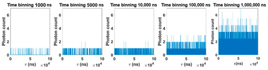 Another way of assessing the effect of time binning is to investigate the photon count per time bin. As discussed previously, the original time correlated photon count data have a binary format where “0” means no photon, and “1” is a photon counted. As photon counts are sparse, substantial binning can be performed while retaining the binary format of the data vector. This is illustrated in Figure 5 showing the photon count per time bin vector after subject to different amount of binning in the range 103–106 ns. As shown by the figure the vector is sparse and binary up to a binning of 103 ns. This also explains the lack of autocorrelation information observed for low binning in Figure 4. When increasing the binning (>5 × 103 ns), the photon counts per time bin start to increase above one, as shown by Figure 5, and the vector is no longer binary. Increasing the binning further both elevate photon counts per time bin and noise level. This agrees with data based on concentration fluctuations should follow Poisson statistics [12]. Similar behavior was observed for correlation data acquired from similar solution using 40× objective lens (see further Supplementary data, Figure S2). Therefore, it is important to choose a binning window for which data obey this condition. From these two analyses exploring the effect of time binning, it can be concluded that the optimum time binning is around 104–105 ns for this experimental setting. This also verifies the need to validate time-binning before performing any FCS analysis using TCSPC raw data in form of photon arrival times in order to ensure relevance of data.