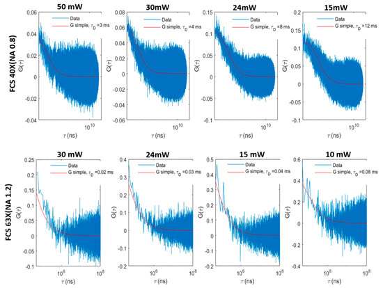 Figure 7 shows the effect of excitation power on FCS measurements when the excitation power was varied between 15–50 mW and 10–30 mW for the two different objective lenses, 40× and 63× respectively, and the corresponding data and FCS model fitting are plotted. Different ranges of excitation power were applied for the objective lenses since the effective peak power inside the detection volume is expected to vary due to the difference in NA. The acquired FCS curves were found to depend on excitation intensity for both objective lenses. It is evident from the figure that excitation power will affect both parameters G(0) and diffusion time τ. In the case of the 40× objective lens, reliable FCS data were not obtained when the excitation intensities reached a lower threshold value of 15 mW and higher threshold value 50 mW. A similar behavior was observed for the 63× objective lens.