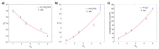 Plot of the (a) autocorrelation amplitude function G(0) acquired using simple data fit (G(0) ~(I/I0)3/2) and (b) number of particles N using data fit (N~(I/I0)3/2) on autocorrelated data (time binning 10,000 ns) from experimental measurements of a Rhodamine B solution (10 nM), the 63× (NA 1.2) objective lens as a function of different laser powers. (c) the effect of excitation intensity on an average photon count. Data points in blue and red line is fitting.