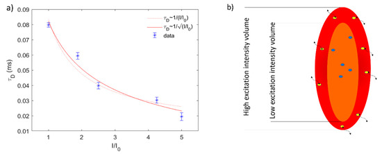 (a) Plot of the diffusion time acquired using simple data fit (~1/(I/I0)0.5 on autocorrelated data 10,000 ns) from experimental measurements of a Rhodamine B solution (10 nM), the 63× (NA 1.2) objective lens as a function of different laser powers. Data points in blue. Red lines represent fitting to two different models (~1/(I/I0)0.5 and ~(I/I0)) demonstrating a 1/r dependency where r is related to the size of focal volume, which will increase as laser power increases as shown in (b).