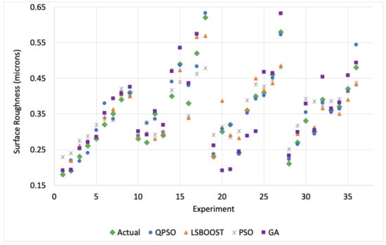 Actual surface roughness values with the predicted values by QPSO, LSBoost, PSO and GA algorithms.