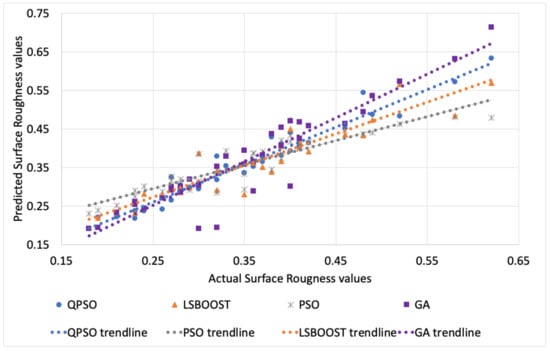 Actual values of the surface roughness vs. predicted values by QPSO, LSBoost, PSO and GA with R2 trend lines.