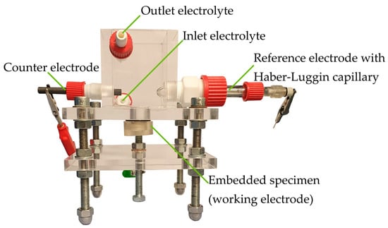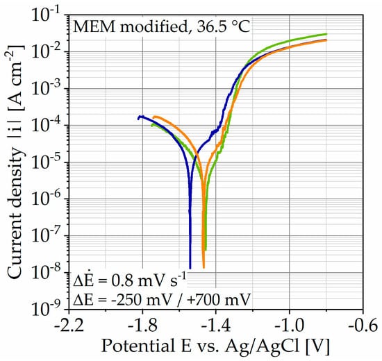 For all investigations, the same experimental setup is used, it consists of a self-developed corrosion cell, which is continuously supplied with an electrolyte via a peristaltic pump. The electrolyte is kept at a temperature of 36.5 °C by a thermostat. The electrolyte used is a minimum essential medium (MEM, Nr. 31095029, Life Technologies, Carlsbad, CA, USA) with an addition of 1% glutamine. This composition is comparable to the physiological human blood plasma (Table 1), hence, to the in vivo situation, and could be evaluated as suitable in previous studies [10,26].