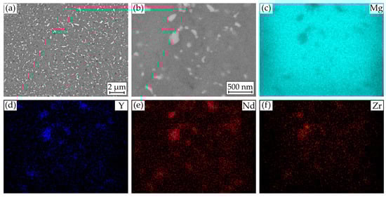Figure 2a,b show characteristic scanning electron microscope (SEM) images of the microstructure in its initial condition. Over the entire area, precipitates of alloying elements of various shapes and sizes are distributed. Most of the precipitates have a circular or stick-like shape, but no uniform orientation of the sticks is discernible. The size ranges from a few 100 nm to about 1 µm. Furthermore, the precipitates are hardly distinguishable from each other in terms of their contrast. The energy dispersive X-ray spectroscopy (EDS) mappings (Figure 2c–f) confirm the assumption that these are enrichments of the alloying elements and areas with a lower magnesium content. Yttrium- and neodymium-rich precipitates are mainly present. Zirconium can also be detected in some cases. The mappings also show that yttrium and neodymium are detected simultaneously in the magnesium-poor regions and that these must therefore be intermetallic compounds of both elements resulting in the homogeneous contrast despite the density differences. Due to the small precipitates size, a quantitative determination of the compounds is not possible.